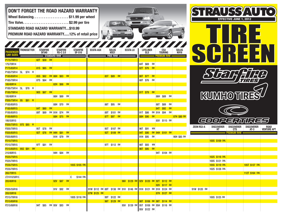 Strauss’s tire list would change monthly, with new prices or discontinued tire tires from many of the top brand names. This was a tri fold that customers in the store can use to find their size and see the price if it was in stock.